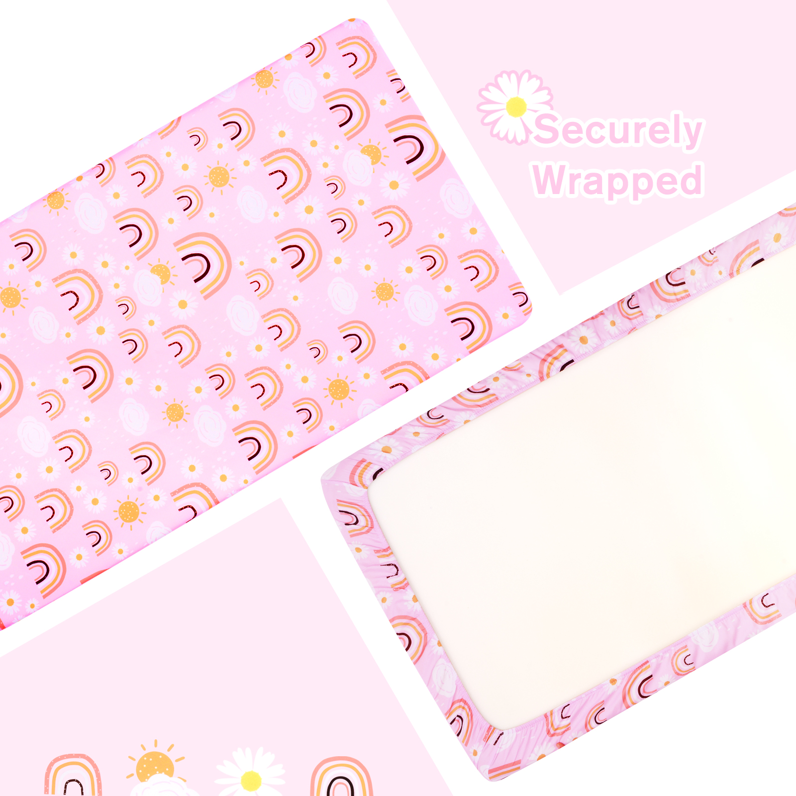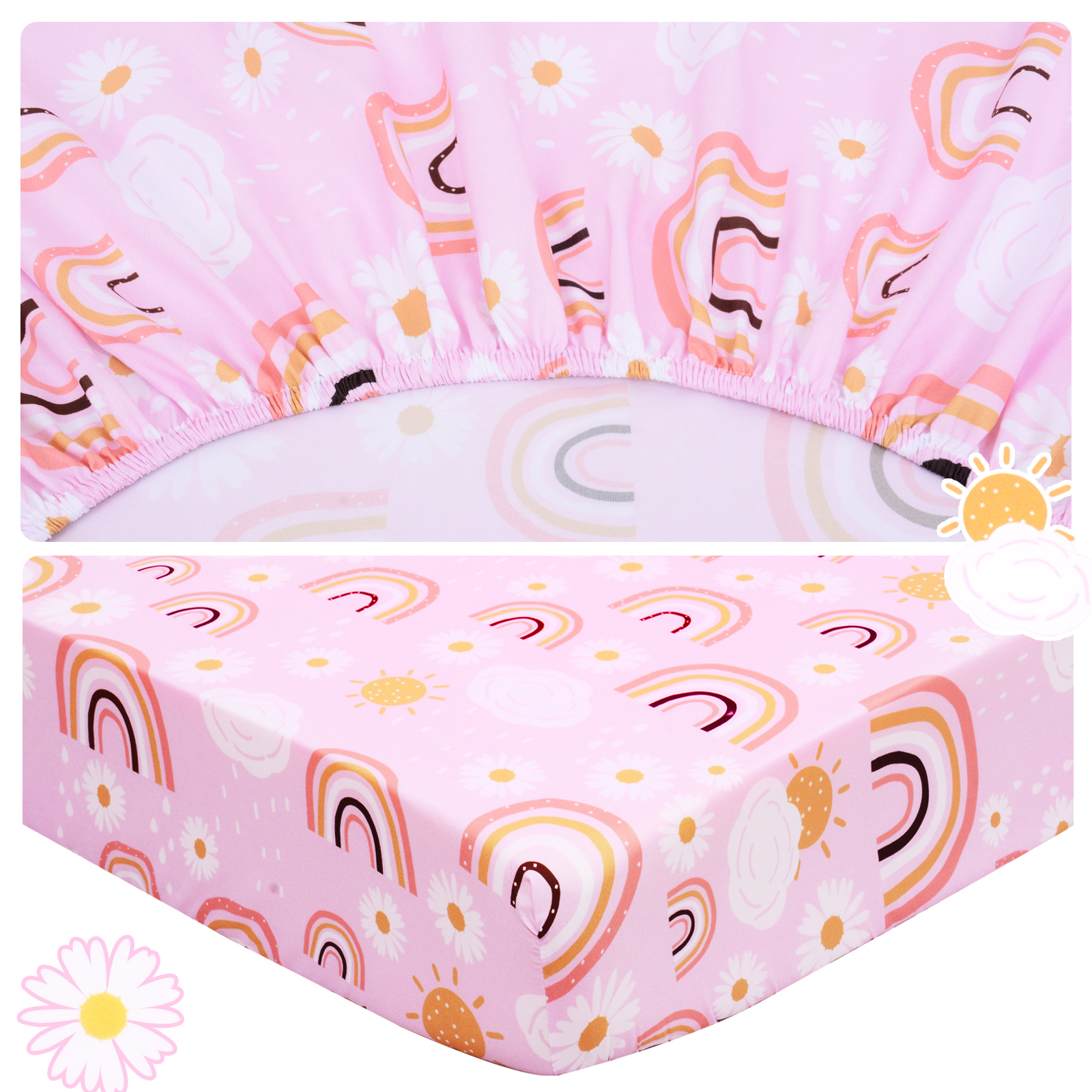 【Cute Pattern】This crib fitted sheet for girls adopt some elements that girls like:rainbow,sun,flowers. Perfect decoration for baby girls' room, daycare room or nursey. A ideal gift choice as baby shower gift, birthday present or Christmas present for baby.