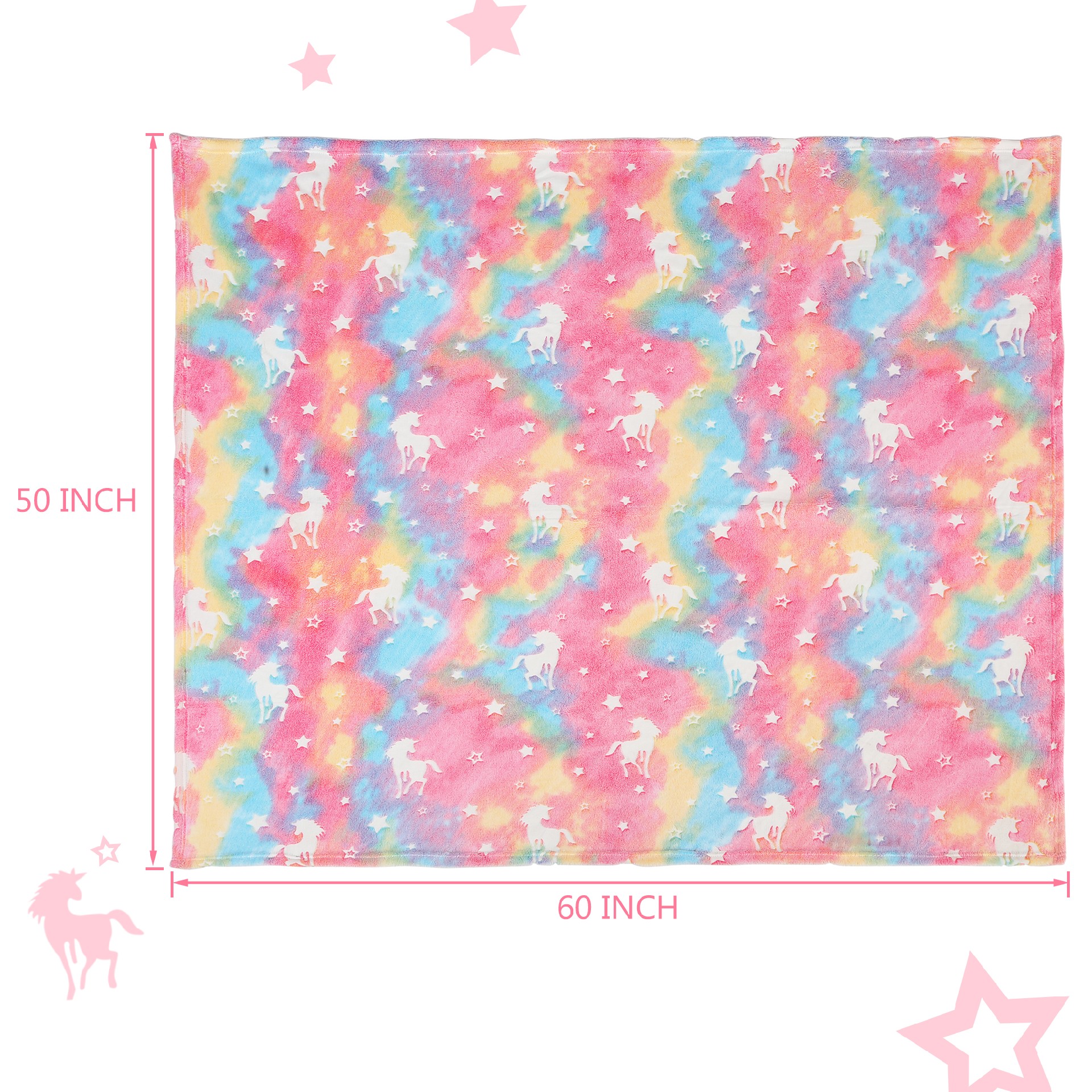 Unicorn Decoration Toy: 60x50 inch.This unicorn blanket is perfect for snuggling up on the couch, adding an extra layer of warmth to your bed, or taking along on camping trips. Add a fun and relaxing touch to any room.Pink unicorn blanket is also supplies as unicorn costumes for girls on unicorn party.